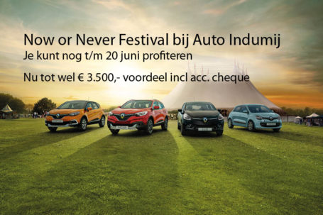 Tot 20 juni kun je nog profiteren van Now or Never voordeel bij Auto Indumij. In de afgelopen weken is de actie een groot succes gebleken, vele nieuwe Renaults en Dacia’s werden er verkocht bij Auto Indumij. Ben je nog niet in de gelegenheid geweest om een offerte aan te vragen óf één van onze showrooms te bezoeken? Je hebt nog tot 20 juni de tijd!
