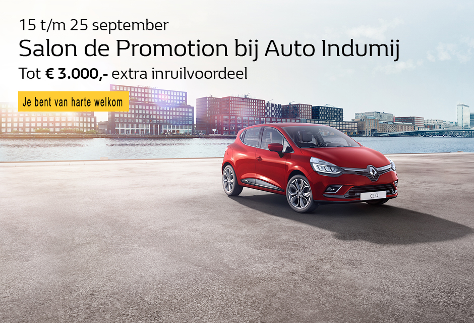 DORDRECHT – Renault-dealer Auto Indumij staat van donderdag 15 september tot en met zondag 25 september helemaal in het teken van Salon de Promotion. Wie tijdens deze actieperiode zijn auto inruilt voor een nieuwe Renault, ontvangt tot maar liefst 3.000 euro extra inruilvoordeel. Dit is hét perfecte moment om voor een nieuwe Renault te kiezen.