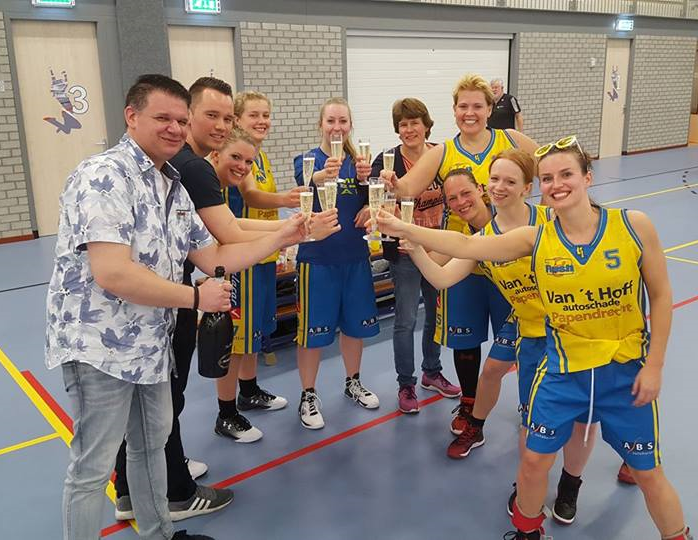 PAPENDRECHT – Vorig seizoen behaalde het eerste damesteam van de Papendrechtse basketbalvereniging Flush ’72 ongeslagen het kampioenschap. Dit seizoen werd de uitdaging een niveau hoger gezocht in de tweede klasse. De tegenstanders waren beduidend sterker en daardoor de wedstrijden veel spannender. En toch lukte het het team opnieuw. Vrijdag werd in eigen huis de grootste concurrent voor de titel, Binnenland uit Barendrecht, in eigen huis verslagen. Eerder dit seizoen werd de uitwedstrijd tegen dit team verloren. In een bomvol Papendrechts Sportcentrum waren de rollen nu omgedraaid. In een echte kampioenswedstrijd, met niet het beste spel, aardig wat balverlies en niet veel scores, wist de thuisploeg uiteindelijk dertien punten meer te maken en kon voor de tweede keer op rij het feest losbarsten.