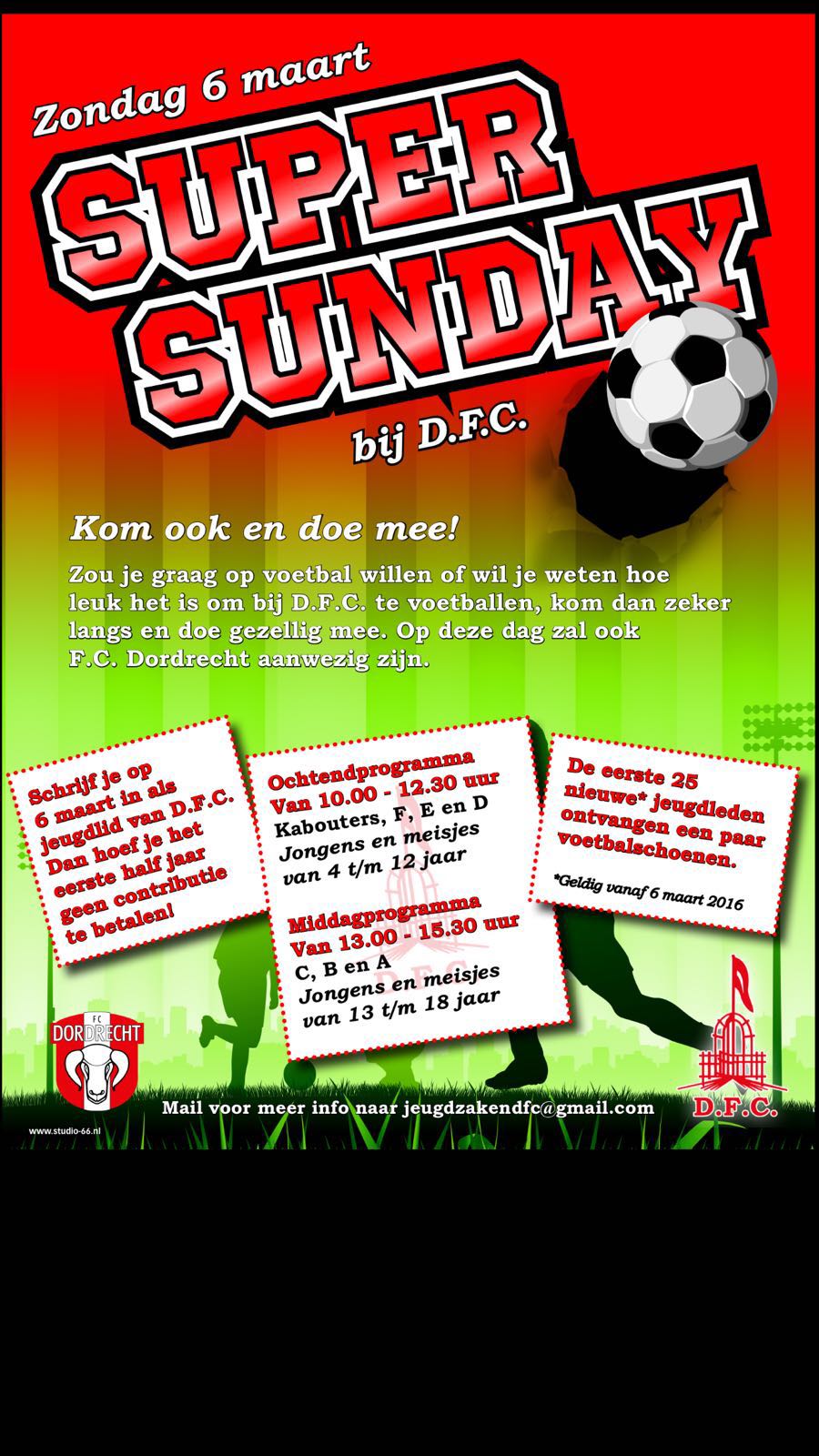 DORDRECHT – Bij voetbalvereniging DFC aan de Reeweg Oost is het zondag 6 maart Super Sunday. Deze dag is voor iedereen van 4 tot en met18 jaar die kennis wilt maken met voetbal en DFC in het bijzonder. Er zullen allerlei trainingsvormen plaatsvinden met medewerking van FC Dordrecht en de KNVB. Wie zich op deze dag aanmeldt als lid betaalt het eerste half jaar geen contributie. En de eerste 25 nieuwe leden die zich naar aanleiding van deze dag aanmelden, krijgen een paar voetbalschoenen.