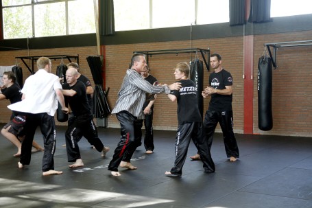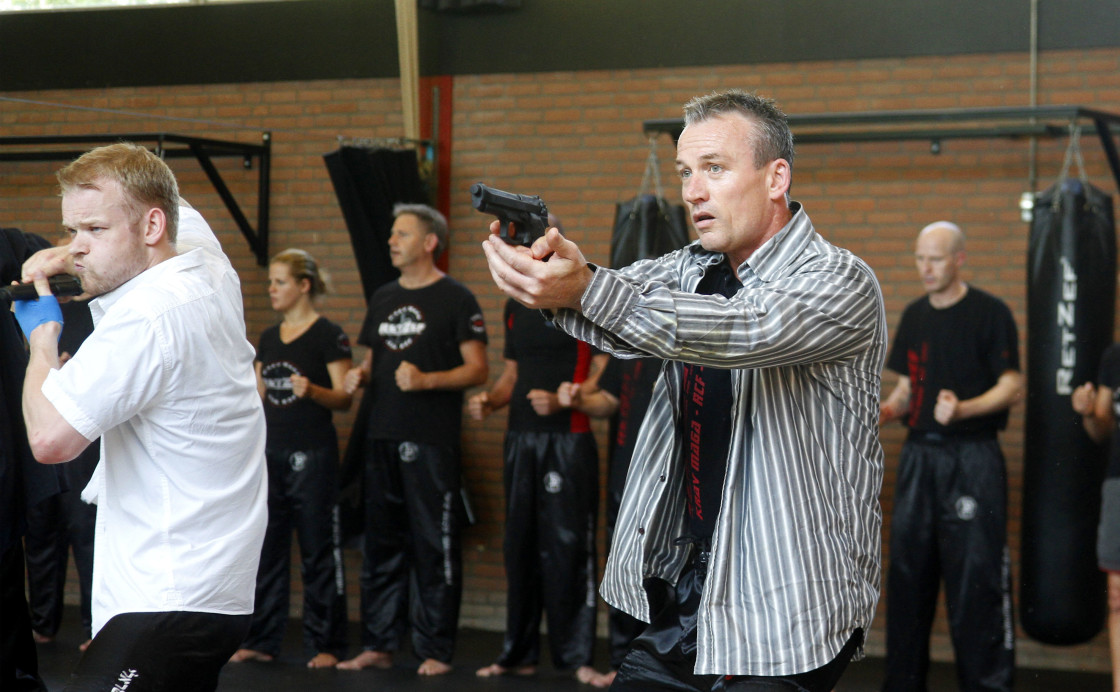 DORDRECHT – Dordtenaar Nico van den Broek (50) werd zaterdag door een groep van 25 man aangevallen in de dojo van RetZef Krav Maga aan de Domela Nieuwenhuisweg in Crabbehof. Deze zogenaamde ‘Circle of Fear’ vormde onderdeel van het slopende zwarte band-examen dat hij aflegde. “Een unieke gebeurtenis, waarvoor hij negen jaar heeft getraind”, vertelt zijn leraar Timo Hennekes. (Foto’s: Thymen Stolk)