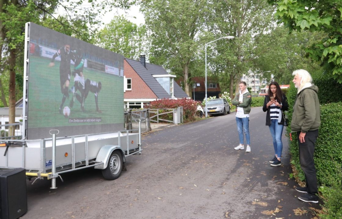 DORDRECHT – FC Dordrecht had vrijdag een leuke verrassing in petto voor enkele trouwe fans en vrijwilligers. Er werd een groot mobiel LED-scherm voor hun woon- of werkadres geparkeerd. Daarop werden wedstrijdbeelden vertoond en werden zij met een persoonlijke boodschap toegesproken door selectiespelers. “Een mooie manier om onze trouwe supporters en vrijwilligers in het zonnetje te zetten en bij de club betrokken te houden”, zegt Jordi Fok van de commerciële afdeling van FC Dordrecht. (Foto’s en video: Thymen Stolk)